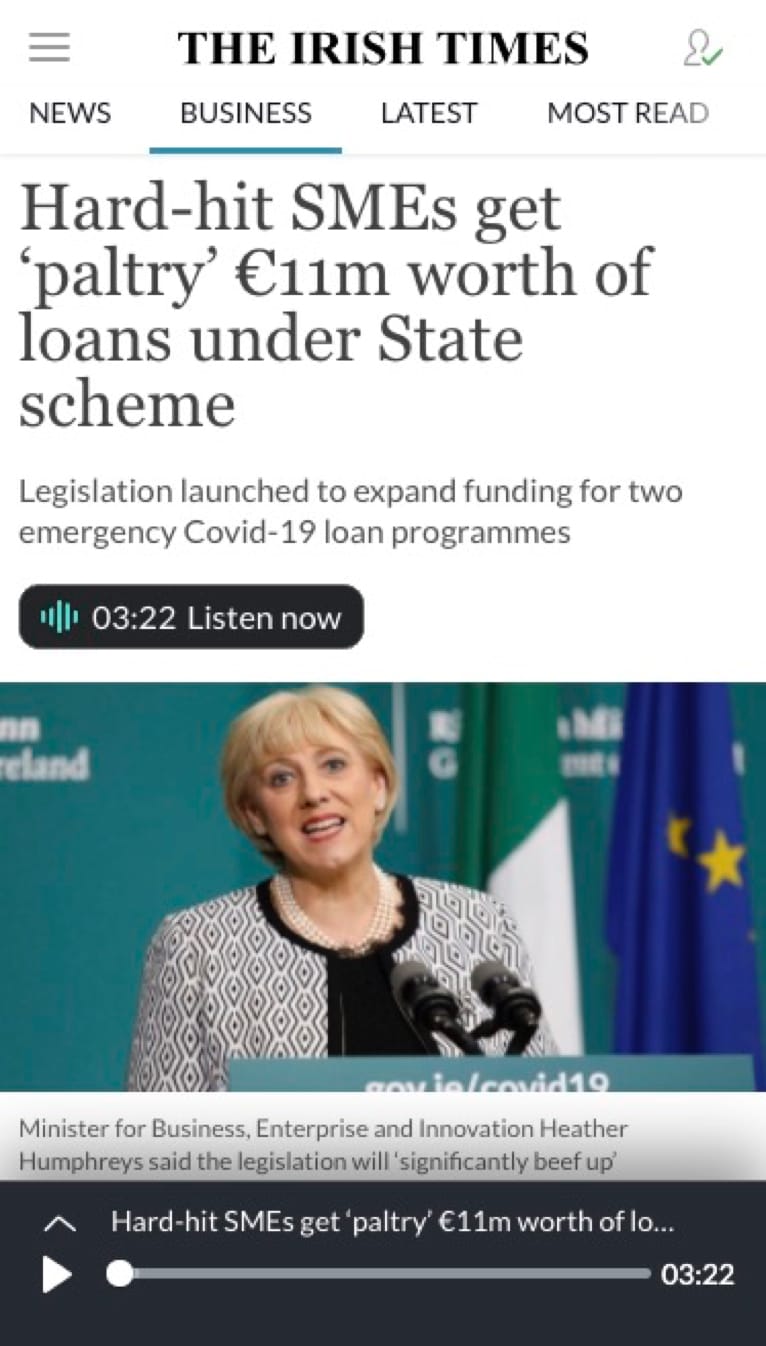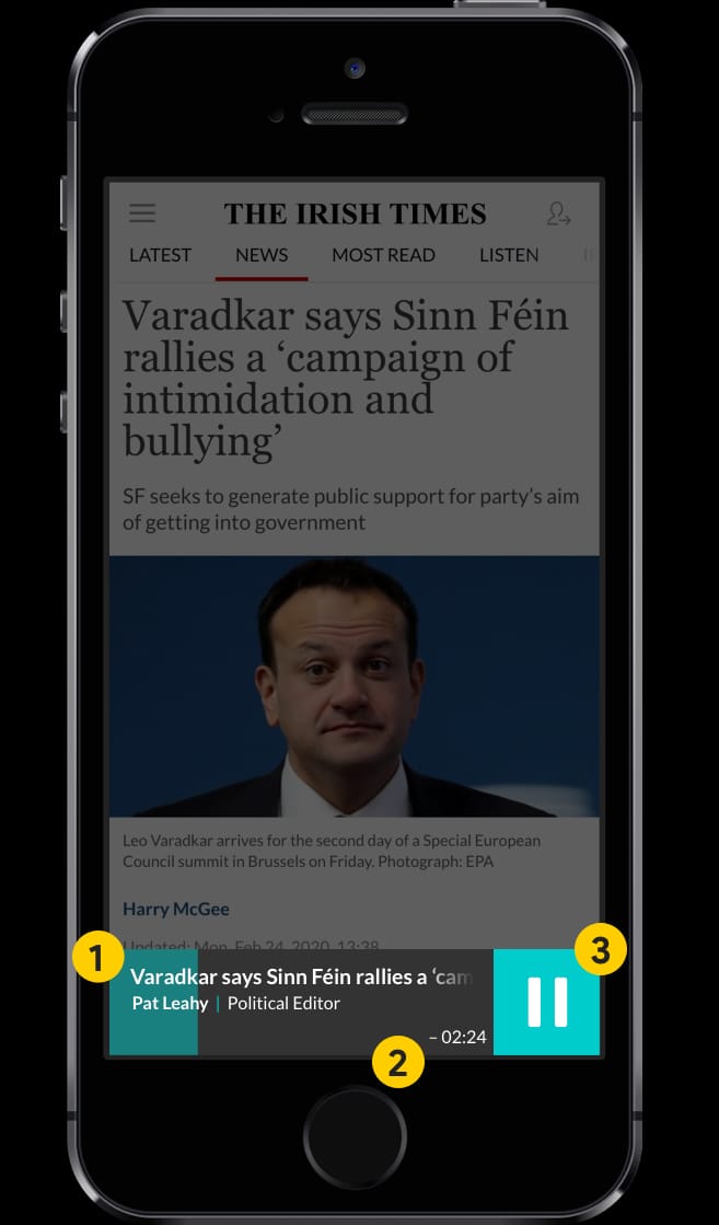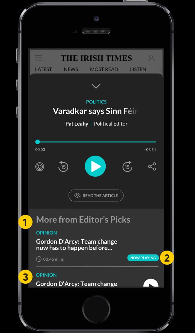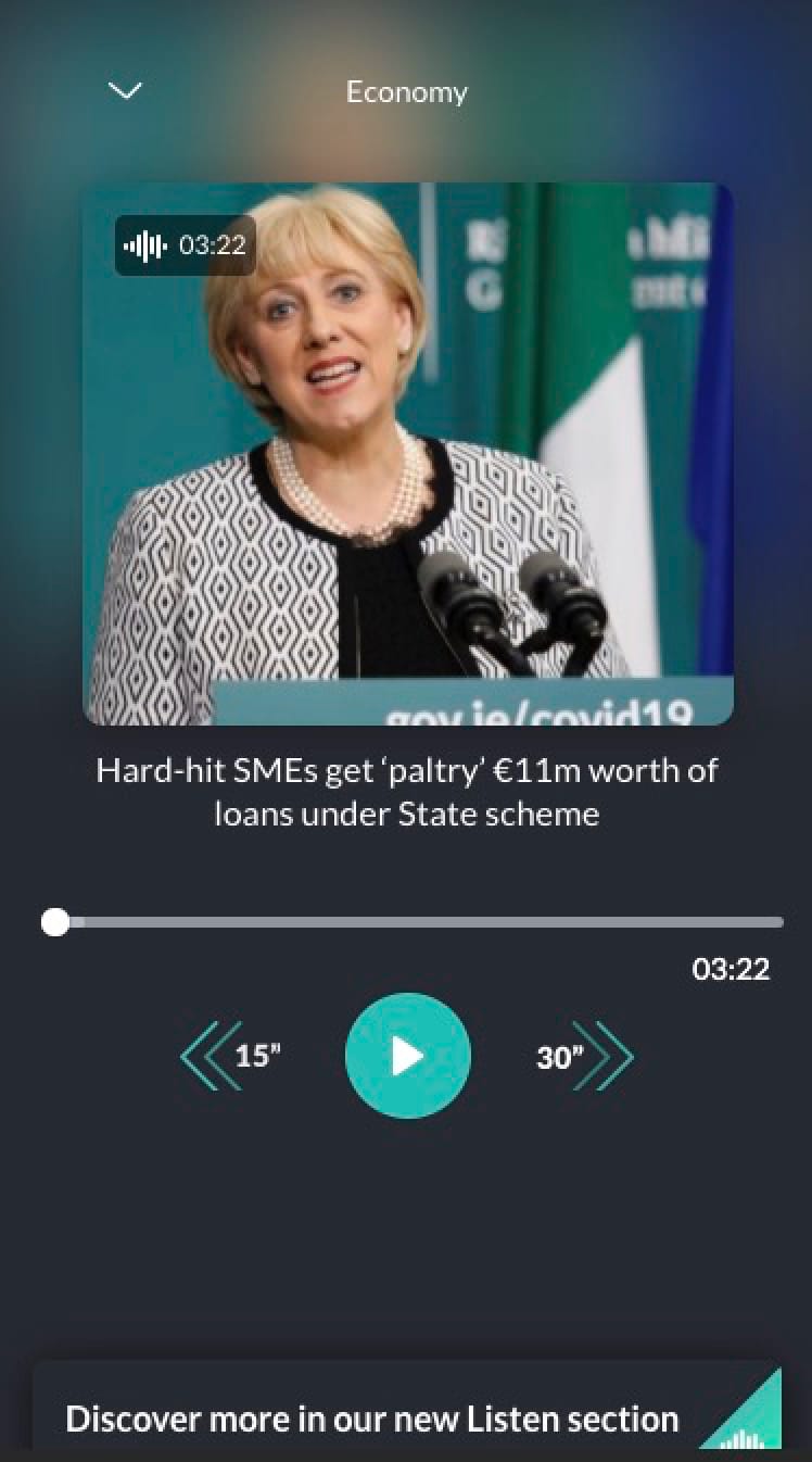 Imagine you are busy driving, commuting, exercising or you are visually impaired and you want to keep up to date with the latest news. "Listen" is a unique media service from The Irish Times, giving the readers the option to listen to text articles or podcasts. (see journey from homepage in the video below)