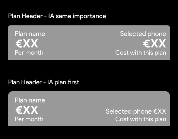 The plan header (mobile) will have 4 key content elements which we can rank visually: Plan name, price, phone name and phone price.