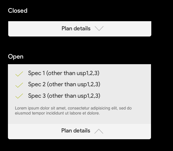 In the new plan design, the details are placed at the bottom of the plan’s card. The logic behind it is that the 3 USP’s could be enough for the user to make a decision, so adding details between the USP’s and the CTA might add friction. Another improvement is that we won’t repeat the plan specs in the details section, it will complement the USP’s.